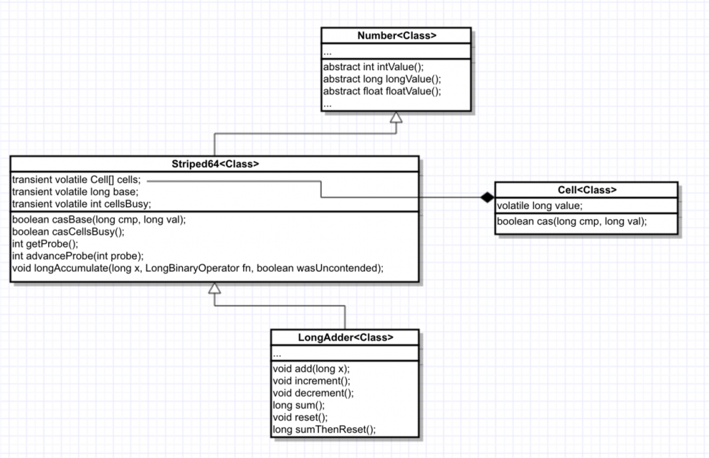 Striped64通过两个成员变量来管理value,分别是base和cells,cells是一个数组,其元素是Striped64的内部类Cell的实现,Cell很简单,只记录一个value。