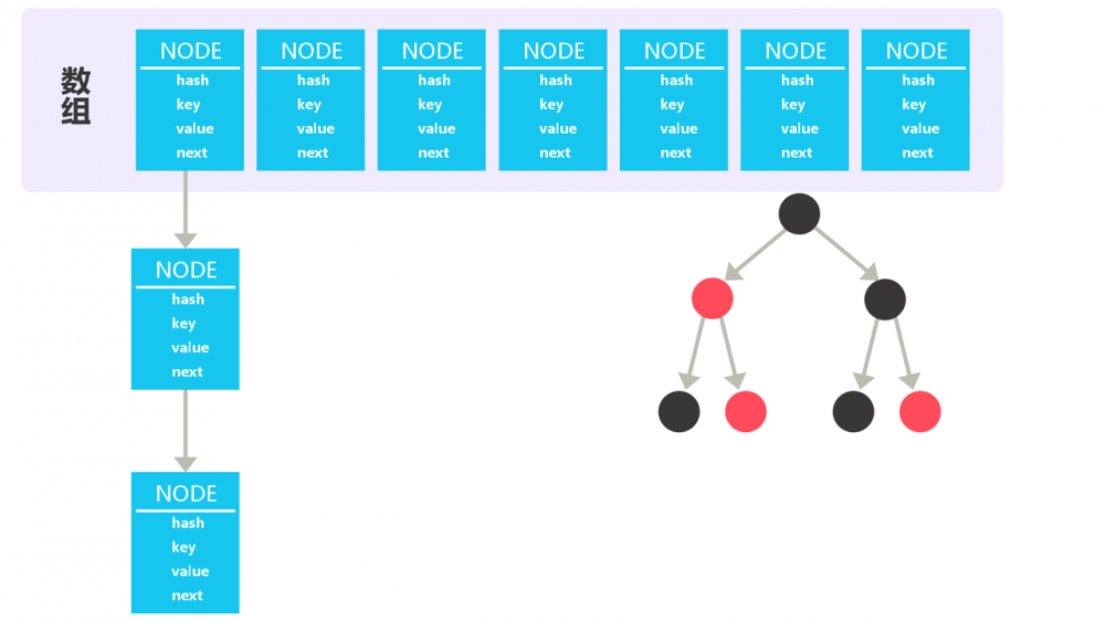 hashMap主要由Node类型的数组,链表,红黑树组成。 从图中可以看出,数组中存储Node对象,每一个Node对象关联了一个链表,如果链表中元素超过8个就使用红黑树存储。