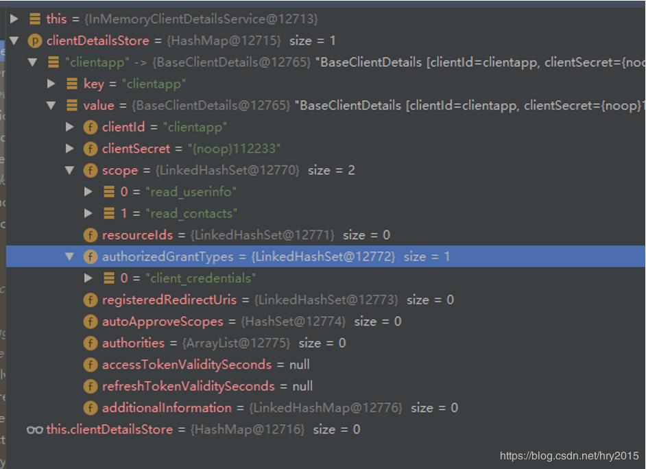 我们首先研究InMemoryClientDetailsService里返回的ClientDetails实例值如下: