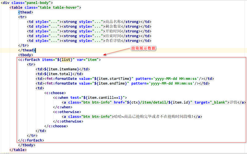 (4)接下来是开发一个页面list.jsp用于展示“待秒杀商品列表的信息”,下面展示了该页面的部分核心源码,如下图所示: