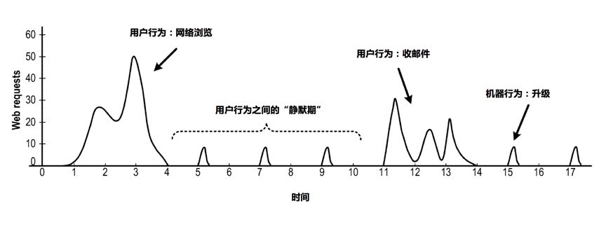 上图是一个设备在17秒内的传出流量示意图,传出包括用户和机器流量两类。当用户活动时生成大量连接请求,当用户不活动时进入静默期,我们需要检测静默期,分析流量异常。