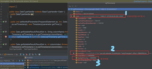 因为使用的数据源为Druid,其中 getNullableResult(ResultSet rs, String columnName) 方法参数中 ResultSet使用了DruidPooledResultSet.java 的 getTimestamp(String columnLabel) ,通过列名称获取值然后转换为Date类型的值。