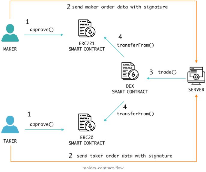 Taker方面使用Moldcoin(ERC20)购买ERC721资产。DEX智能合约批准任何数量的MOLD,使_spender成为Dex合约,以便它可以处理MOLD币。Maker方面出售ERC721。为了允许DEX Contract发送ERC721资产,请将 Dex Contract批准为_spender。