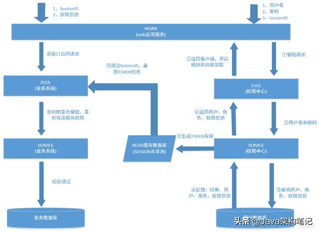 1、用户通过用户名、密码发起登陆请求,这里可以配合验证码、短信验证、微信验证等提高安全级别,登陆请求访问到权限中心的ZUUL。