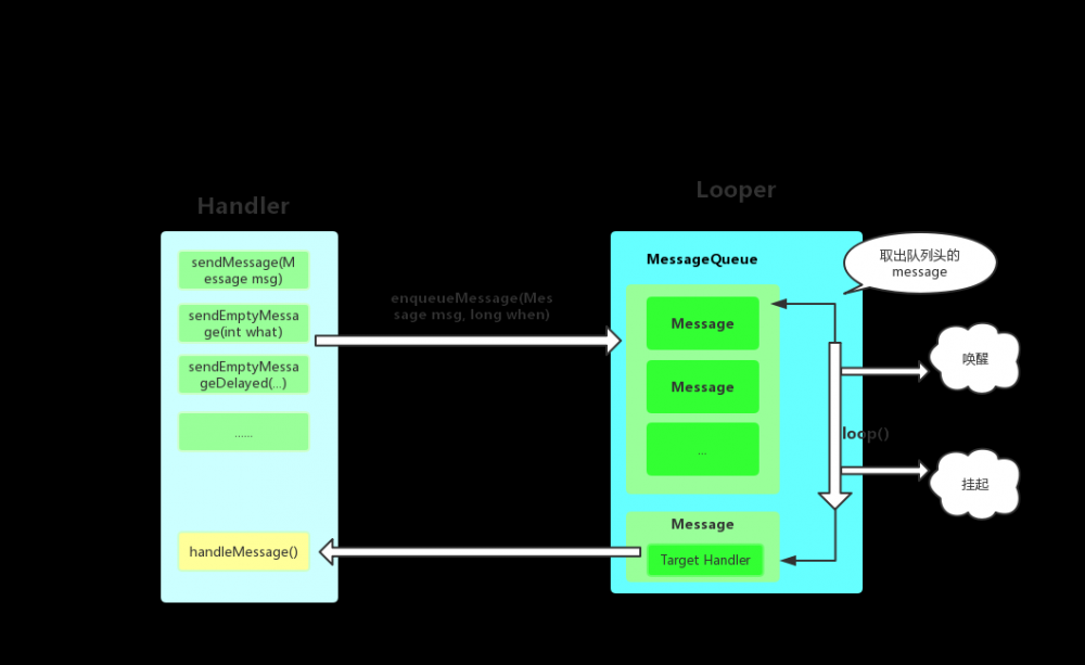 主要是指 enqueueMessage () @MessageQueue 进行唤醒。