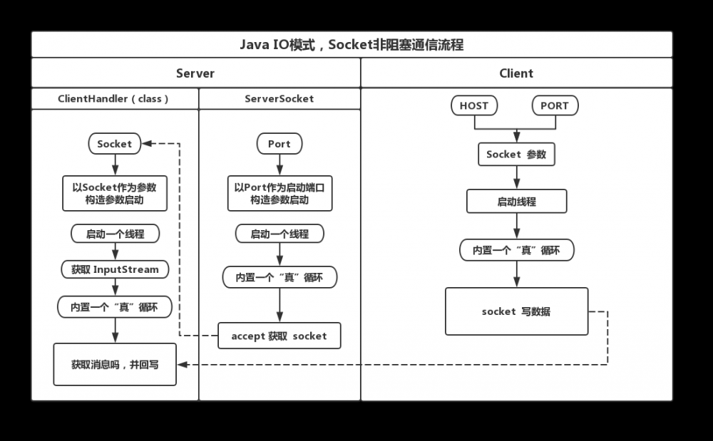 这里我们使用一个内嵌的永久循环,来让Socket成为一个非阻塞的通信流程。