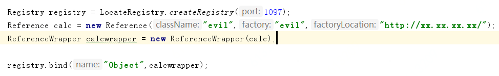 产生JNDI注入的原因简单来说是lookup方法参数可控,我们首先在Registry中绑定特殊构造的Reference对象,如下图所示,其中factoryLocation是我们远程类的地址。
