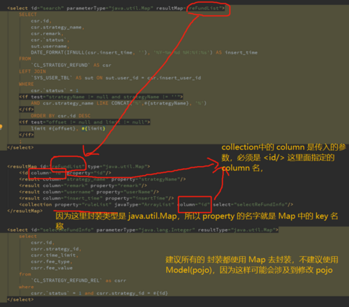 <collection property="ruleList" javaType="ArrayList" column="id" select="selectReFundInfo"/>