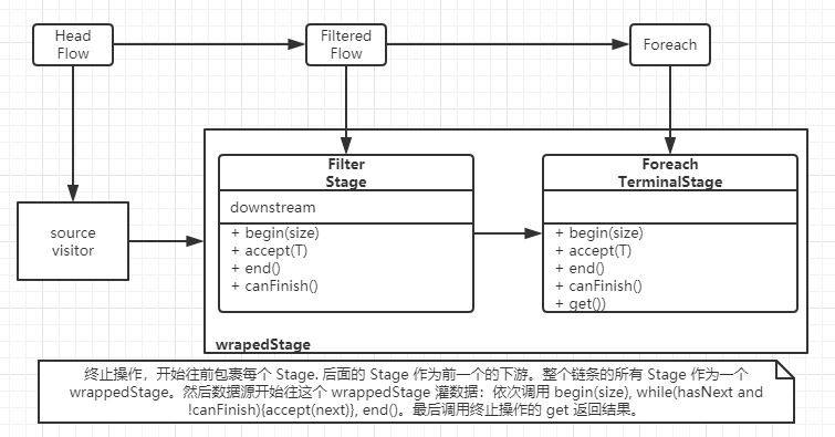 start 中首先将每个阶段的动作都包裹起来, 从终止操作的 TerminalStage 开始, 作为前一个阶段的下游依次往前包裹每个 Stage 即 wrapStage 和 每次需要重写的 wrapDownstream 方法。 然后调用包裹了所有操作的 stage 的 begin/accept/end 方法,执行整串动作。
