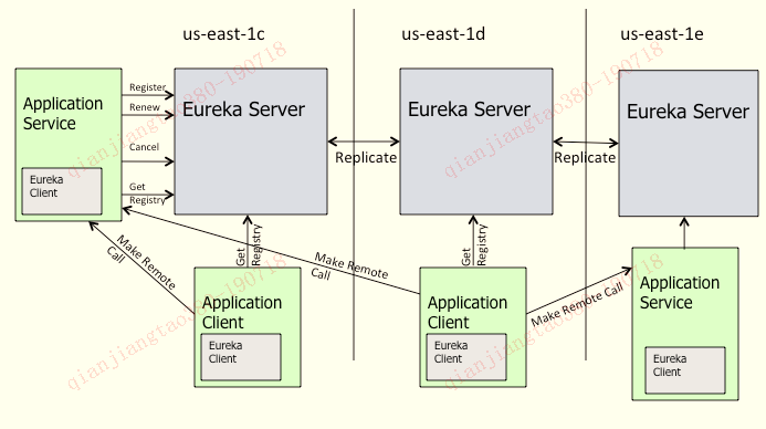 上图是来自官网的架构图,其中us-east-1c和us-east-1d,us-east-1e是代表不同的区也就是不同的机房,其中每一个eureka server都是一个集群。application service作为服务提供方向eureka中注册服务,eureka server接受到注册事件会在集群和 分区中进行数据同步,application client作为消费端可以从eureka中获取到服务注册信息,进行服务调用。这是作为注册中心 一个最简单的流程,其中有隐藏了很多细节问题,接下来让我们扒一扒其中的一些细节。