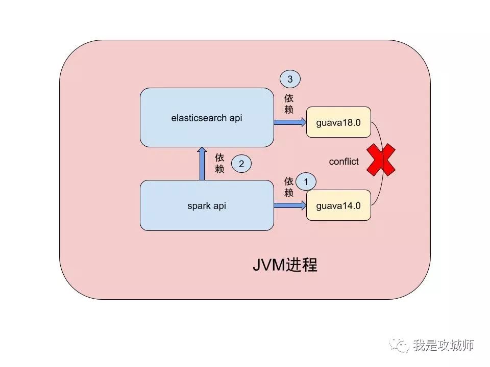 如此已来,这个shade jar里面的es就只对这个版本的guava进行了绑定依赖,这个时候在spark项目中,引入这个es的uber-shade-jar,就不会发生冲突,通过使用不同的包名完美解决了类冲突的问题,这两个类都可以被同一个JVM虚拟机加载,这样以来,spark仍旧可以使用guava14.0版本,而我们的es也可以完美的使用改名后的guava18.0的版本,从而比较优雅的解决了这种不可避免的多版本冲突问题。
