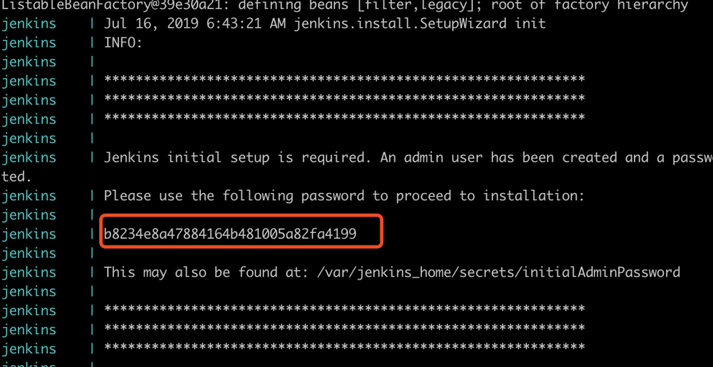 当 jenkins 正常运行时,启动日志中会有第一次登陆需要的管理员密码,如下: