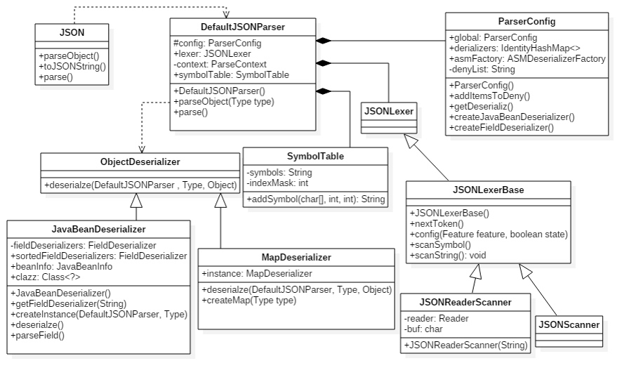 并不需要关注json序列化及反序列化的过程。深入Fastjson框架,可以看到其主要的功能都是在 DefaultJSONParser 类中实现的,在这个类中会应用其他的一些外部类来完成后续操作。 ParserConfig 主要是进行配置信息的初始化, JSONLexer 主要是对json字符串进行处理并分析,反序列化在 JavaBeanDeserializer 中处理。