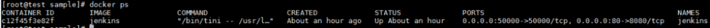 -d 后台运行镜像 -p 80:8080 将镜像的8080端口映射到服务器的80端口 -p 50000:50000 将镜像的50000端口映射到服务器的50000端口 -v jenkins:/var/jenkins_home 冒号前面的jenkins表示的是docker卷名,冒号后面的 /var/jenkins_home 目录为容器中jenkins工作目录。 -v /etc/localtime:/etc/localtime 让容器使用和服务器同样的时间设置。 --name jenkins 给容器起一个别名