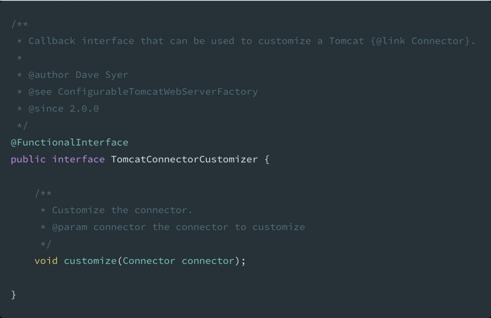 要平滑关闭 Spring Boot 应用的前提就是首先要关闭其内置的 Web 容器,不再处理外部新进入的请求。为了能让应用接受关闭事件通知的时候,保证当前 Tomcat 处理所有已经进入的请求,我们需要实现 TomcatConnectorCustomizer 接口,这个接口的源码十分简单,从注释可以看出这是实现自定义 Tomcat Connector 行为的回调接口: