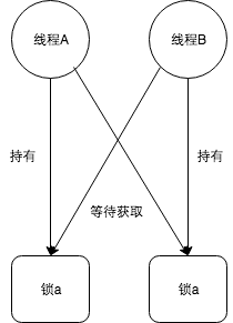 如果此时有一个线程 A ,按照先获持有锁 a 再获取锁 b的顺序获得锁,同时另外一个线程 B,按照先获取锁 b 再获取锁 a 的顺序获取锁。如下图所示: 其实线程 A 就是岳不群、线程 B 是林平之,葵花宝典上下册分别是 lockA,lockB