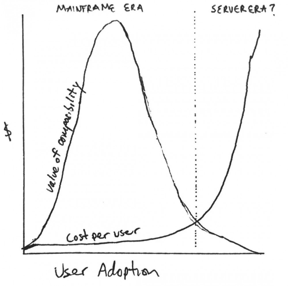 这就是区块链的大型机时代。 尽管可组合性确实带来了早期的网络效应——集中安全性、用户群、数据和代码,但是由于大型机的吞吐量限制,采用量的增加会造成边际收益递减。 这反过来会驱高每一位新增用户和开发者的成本。 绘制成图表则如下所示: