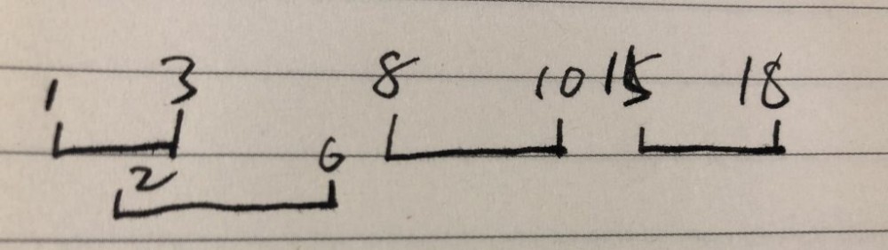 可能会有更复杂的情况,但是我们简单的发现,如果首先按照间隔的左坐标排序,这个题是比较好理解的。然后,我们每次取一个当前的间隔和下一个间隔比较,第一个间隔的右端小于等于下一个间隔的左端的话,难么这两个间隔就是有重叠部分的。那么我们就有了 isOverlap 函数的定义: