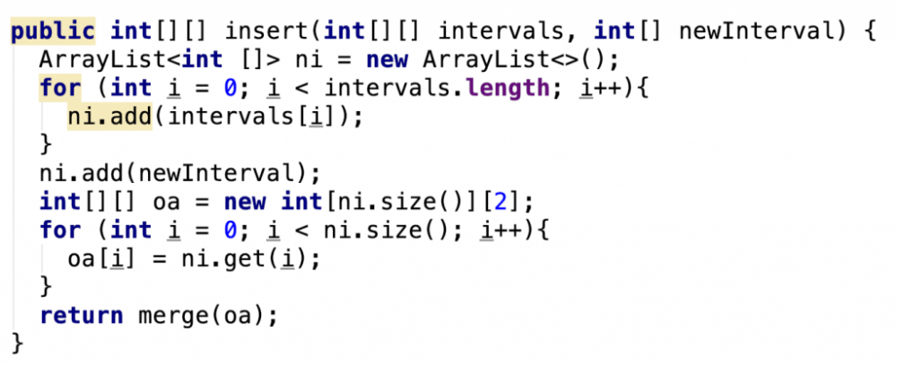 执行耗时3ms,虽然只比 24.68% 的Java提交快,但是我感觉算可以接受得了。如果认真做这道题,应该在已排序数组里面找到第一个已经重叠的间隔合并,然后继续看,直到第一个不重叠的间隔,即可退出,实现难度并不大。是会比当前实现快一些的。