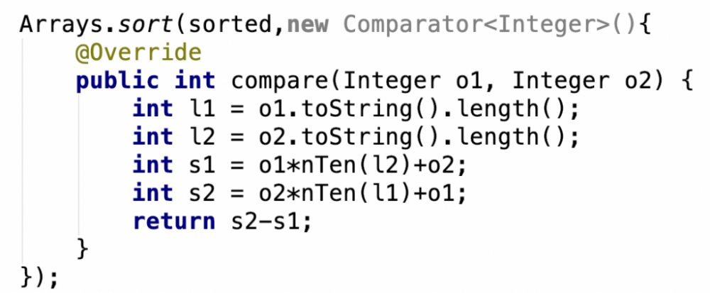 简单的看来,肯定是数值最大的数字在前面,最好,比如9肯定在3前面。但是输入的不是一位数字,也有例外,5小于34,但是5放在前面肯定更大,534大于345。或者34小于330,但是,34330大于33034。