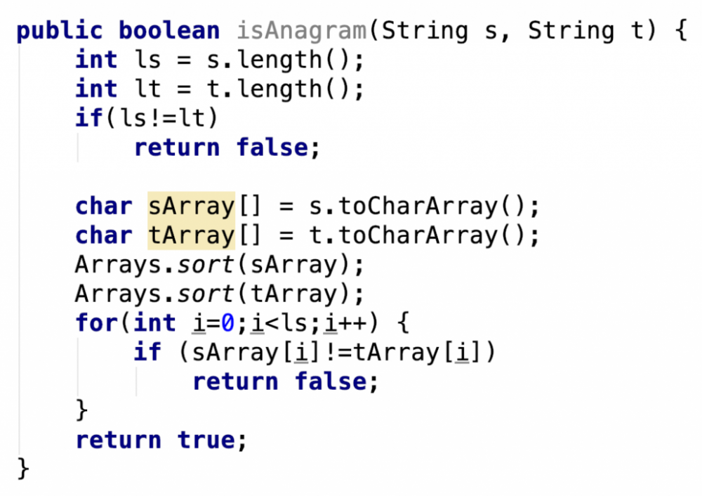 <strong>输入:</strong> <em>s</em> = "anagram", <em>t</em> = "nagaram" <strong>输出:</strong> true