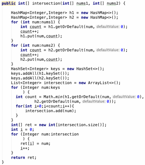 可以先参考349题的解法,其实大同小异,区别在于349题,我们的hashmap只记录一个数字是否存在。现在我们要记录在输出出现的次数。然后比较hashmap,取两个hashmap中计数比较小的值。代码如下:
