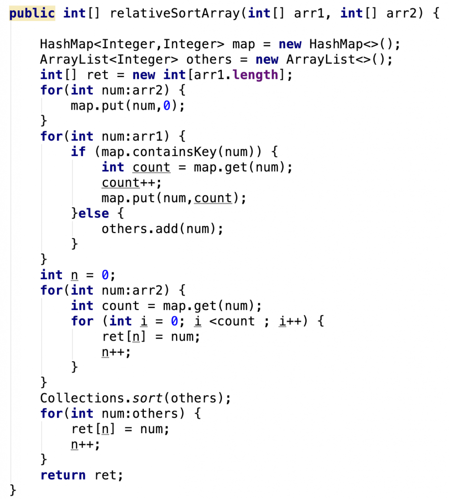 有点繁琐,但是不难。首先我们把arr2全部元素放进hashmap。然后,循环arr1,统计所有在arr2的元素在arr1里面出现的次数。不在arr2的元素扔到others里。然后分别输出hashmap和others里面的元素即可。