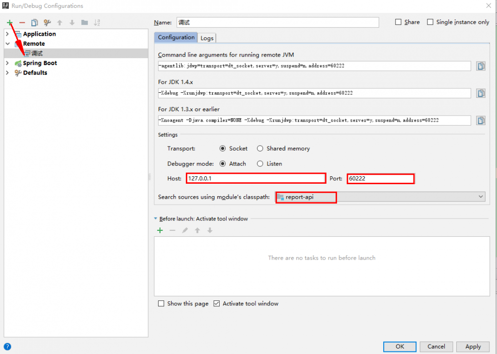 如图,在配置弹窗页面,点击左上角的 + 号添加调试配置页面,配置 Host 为远程服务器地址, Port 为调试端口60222,并选择需要调试的模块,点击 OK 完成即可。