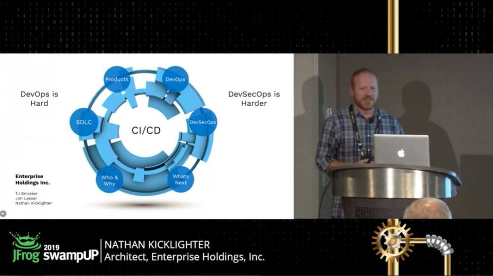 Enterprise Holdings. 的IT团队超过2000人,在2018年的演讲中介绍了Enterprise Holdings的DevOps是如何转型的。 我们通过打造一个不只包涵了pipeline的CI/CD平台,将其称之为SDLC。 在最开始的200+个应用中,我们挑选出5个来作为试点。 当时的情况证明这次DevOps转型计划是成功的,我们的团队有4+位工程师和两位架构师,从2年半前就开始了整个平台的开发工作,根据业务需求确保平台可以适配各种云服务、也要适配已有的中间件,我们也在不断对CI/CD平台进行改进,以适应所有业务场景。 其的目标是让开发人员更专注于具体的项目开发,让工具去解决一些通用性的问题。 为了达到目前的效果,我们做了很多关于平台的需求收集及问题反馈相关的运营工作,所以在过去的一年里,我们已经将此套平台服务于70%的应用中,并且这个数字还在持续的增加。