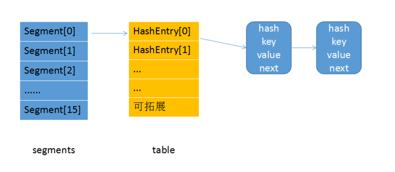 每个Segment又包含了HashEntry数组,HashEntry是一个链表。如下图所示:
