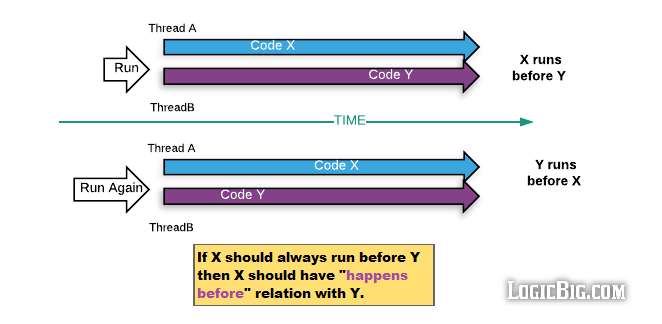 happen-before 的不仅仅是'时间'中的动作重新排序,而且还保证了对内存的读写顺序。执行写入和读取到内存的两个线程可以在时钟时间方面与其他操作保持一致,但可能看不到彼此一致的更改(内存一致性错误),除非它们有happen-before 关系。