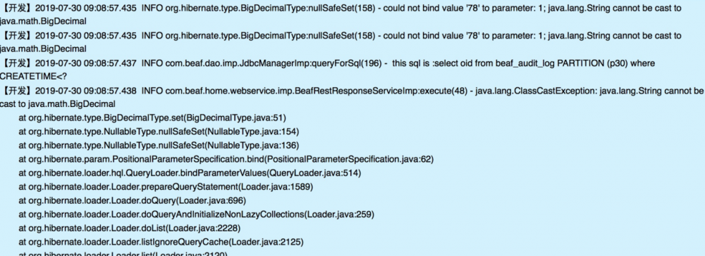 看hql及java对象,发现,参数为string,而参数对应的java对象中的字段类型是BigDcimal。猜测可能是问题出现的原因,但相关的代码没有找到,继续看代码、调试