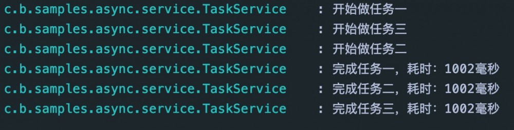 可以看到 TaskService 中的三个方法是异步执行的,接口的结果快速返回,日志信息异步输出。异步调用,通过开启新的线程调用的方法,不影响主线程。异步方法实际的执行交给了 Spring 的 TaskExecutor 来完成。