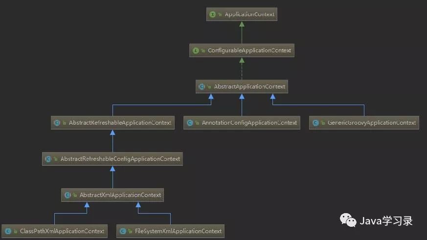 可以看到左下角的就是我们今天的主角ClassPathXmlApplicationContext、然后它的旁边是一个同门师兄弟FileSystemXmlApplicationContext。看名字就可以知道它们哥俩都是通过加载配置文件来启动Spring的,只不过一个是从程序内加载一个是从系统内加载。
