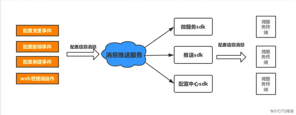 配置实时推送功能依托于微服务平台的配置中心,消息推送平台,微服务SDK完成自身的功能逻辑。其中当消息到达微服务终端时由微服务SDK对消息进行处理。