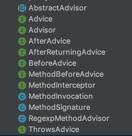 在Spring中,通过配置Advisor和Advice声明一个切面,从而实现AOP功能。笔者参考这个机制,实现了一个简单版本。首先看一下aop包下的定义的类: