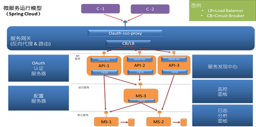 受限于当时技术团队的资源限制,我们根据最小阻力原则,选择了SpringCloud.spring cloud提供了开发分布式服务系统的一些常用组件,例如服务注册和发现、配置中心、熔断器、智能路由、微代理、控制总线、全局锁、分布式会话等。如下图所示: