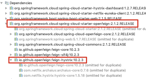 从上图我们可以看到,我们引入Feign依赖的时候,它本身已经依赖了Hystrix,根据Maven依赖的传递性,我们可以知道我们自己的服务已经包含了Hystrix的依赖支持,我们可以直接使用了~