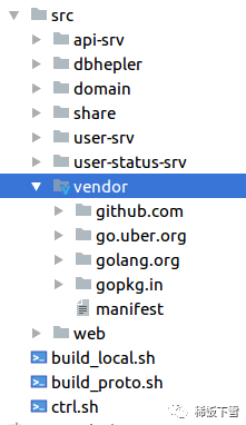 之后在src下面就会看到生成文件夹vendor以及vendor下面生成相应依赖和manifest,之后再多次重复gvt fetch xxx命令即可生成完整依赖(xxx修改为相应的依赖),图示如下: