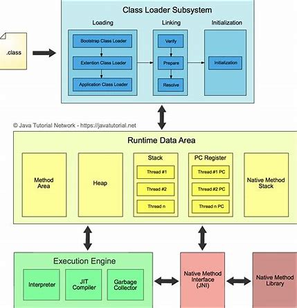 这四大组成部分可以用文字描述如下。JVM 是执行Java 程序的虚拟计算机系统,然后我们来看看执行过程:首先需要准备编译好的 Java 字节码文件(即class文件),计算机要运行程序需要先通过 类加载器 将 class 文件加载到内存中,即 运行时数据区, 但是字节码文件是JVM定义的一套指令集规范,并不能直接交给底层操作系统去执行,因此需要特定的命令解释器,也就是 执行引擎 将字节码翻译成特定的操作系统指令集交给 CPU 去执行,这个过程中会需要调用到一些不同语言为 Java 提供的接口(例如驱动、地图制作等),这就用到了本地 Native 接口(本地库接口)。