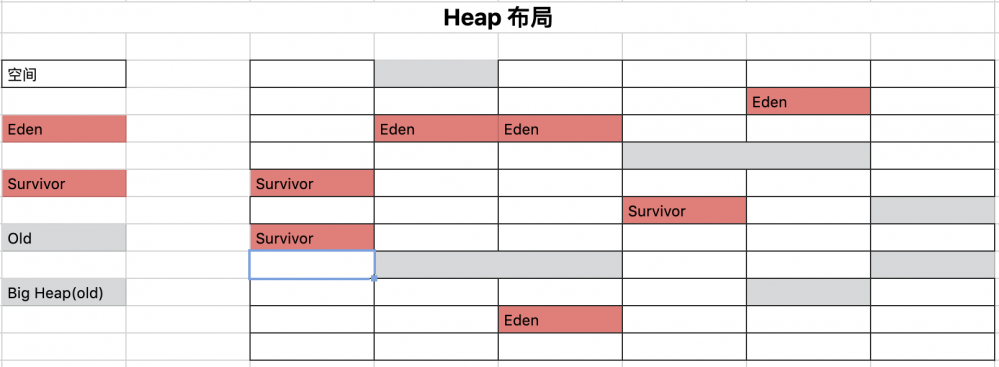 下图中跨区域的灰色模块即代表了超大对象,超大对象是指那些空间大小 >=1/2 个区域空间的对象.超大对象有时候会被以下特殊方式处理: