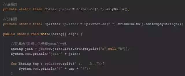 Joiner是连接器,Splitter是分割器,通常我们会把它们定义为static final,利用on生成对象后在应用到String进行处理,这是可以复用的。要知道apache commons StringUtils提供的都是static method。更加重要的是,guava提供的Joiner/Splitter是经过充分测试,它的稳定性和效率要比apache高出不少,这个你可以自行测试下~发现没有我们想对String做什么操作,就是生成自己定制化的Joiner/Splitter,多么直白,简单,流畅的API!对于Joiner,常用的方法是 跳过NULL元素:skipNulls() / 对于NULL元素使用其他替代:useForNull(String)对于Splitter,常用的方法是:trimResults()/omitEmptyStrings()。注意拆分的方式,有字符串,还有正则,还有固定长度分割(太贴心了!)