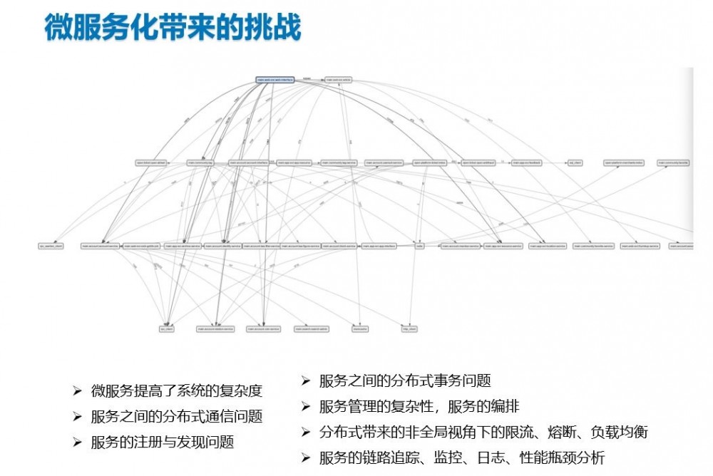 其次,微服务化以后,服务拆分的比较多,调用链也比较长,调用链很容易受到一个坏节点的影响,导致用户端出现超时的现象。另外,负载不均衡会导致热点问题,并影响资源调度;单个节点不可用,如果限流或者熔断手段做的不好可能有雪崩效应;微服务代理的分布式事务问题和分布式一致性问题,以及编排、日志、链路追踪等问题。