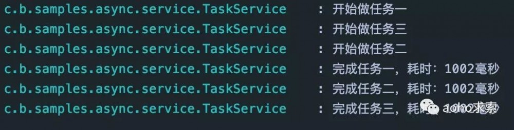 可以看到 TaskService 中的三个方法是异步执行的,接口的结果快速返回,日志信息异步输出。异步调用,通过开启新的线程调用的方法,不影响主线程。异步方法实际的执行交给了 Spring 的 TaskExecutor 来完成。