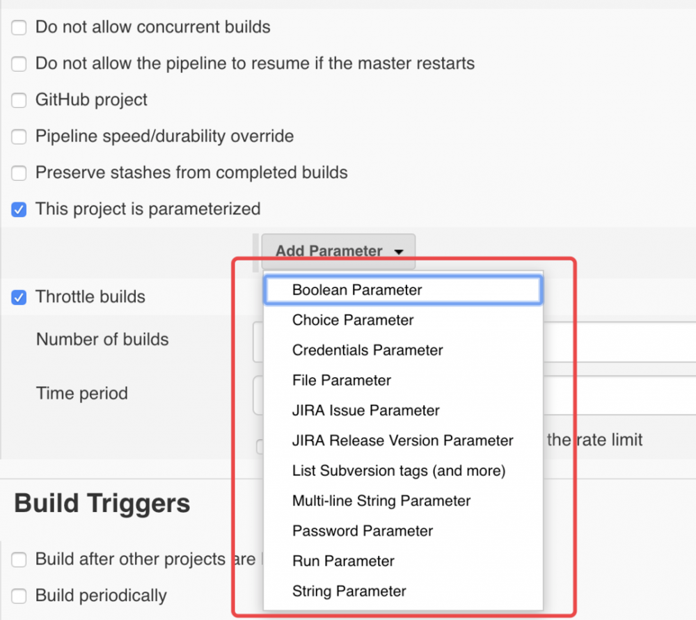 当我们新建的项目为freestyle或pipeline类型,在配置页面的General的tab中会发现有一个选项为 "This project is parameterized" 表示该项目类型为可参数化的,勾选之后,可以添加很多类型的参数,如下图