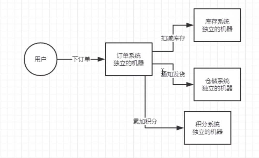 比如现在有一个下单买东西的需求,就需要订单系统、库存系统、仓库系统和积分系统 等来进行处理。如下图: