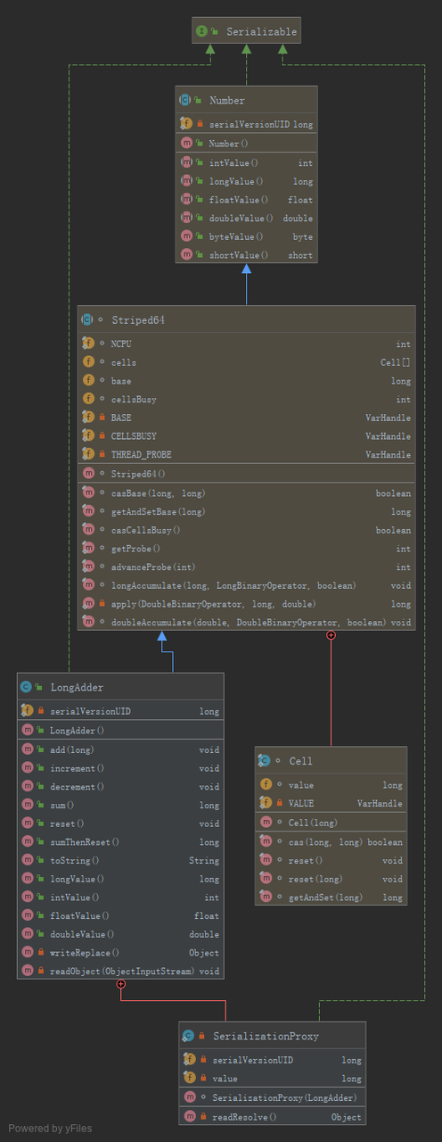 Striped64是package内使用的,对于在64位元素上动态分片提供统一实现(感觉有点像:AbstractQueuedSynchronizer) Striped64继承了Number类,这也就是说具体实现的子类也必须实现相关的内容