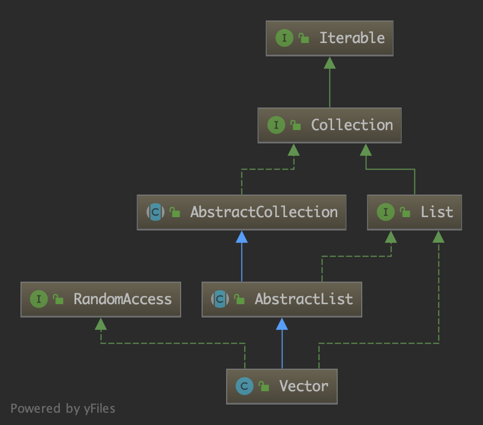 Vector 的内部实现与 ArrayList 类似,也可以理解为一个「可变数组」。 其继承结构如下(省略部分接口):