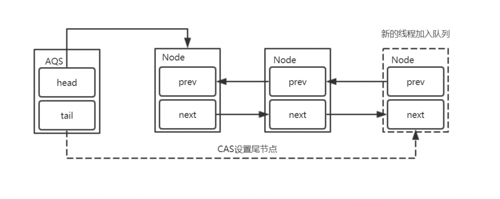 当有锁竞争的时候,当有新的线程加入进来,会将此线程封装成Node节点追加到同步队列中,并将新线程的前置指针指向上一个节点,将上一个节点的后置指针指向新线程的节点。是通过CAS来进行指针指向的这个修改的。